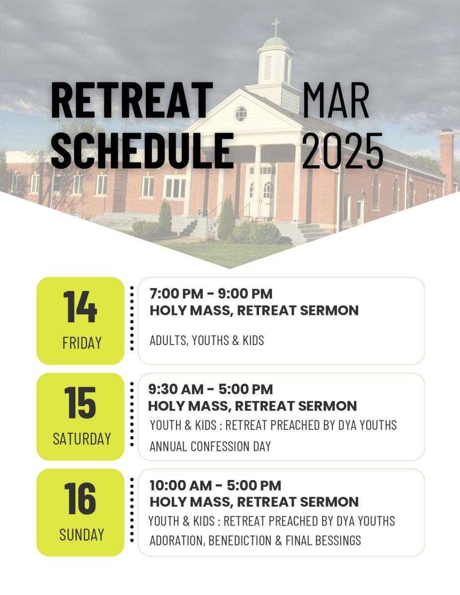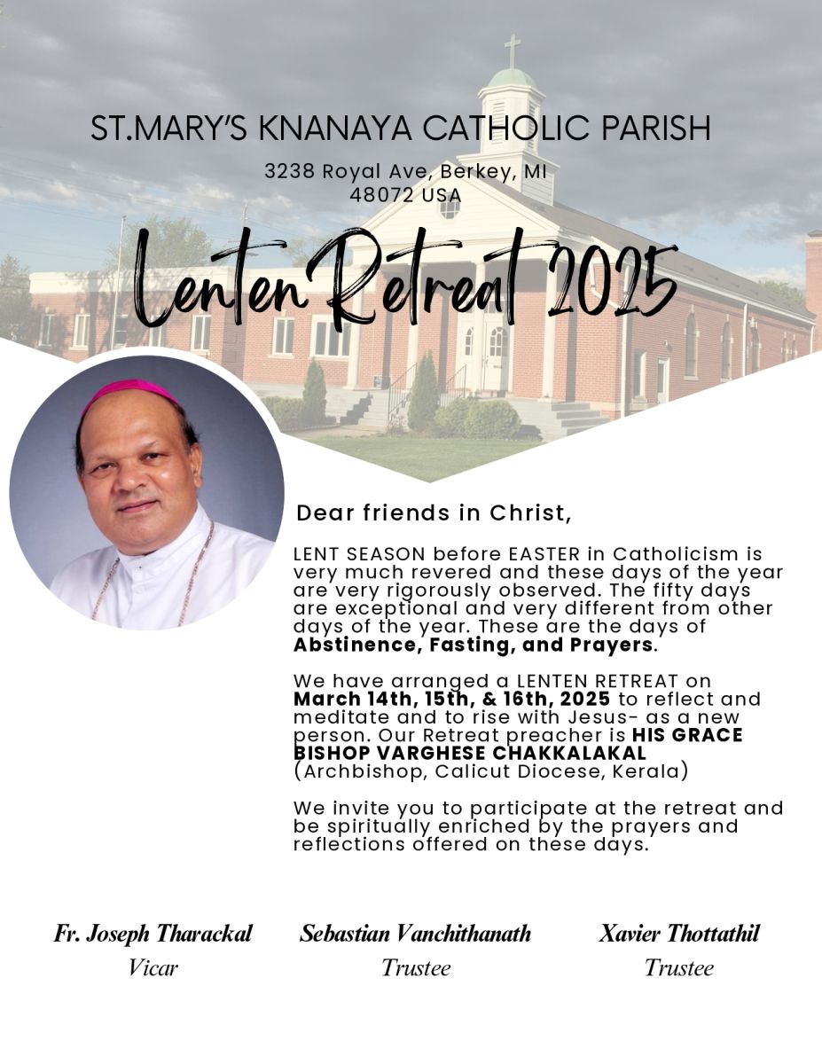 ഡിട്രോയിറ്റ് സെ. മേരീസ് ക്നാനായ കത്തോലിക്കാ ദൈവാലയത്തിൽ വാർഷിക ധ്യാനം നടത്തുന്നു .ധ്യാനം നയിക്കുന്നത് അഭിവന്ദ്യ വർഗീസ് ചക്കാലക്കൽ പിതാവാണ് (Bishop, Calicut Diocese, Kerala).എല്ലാവരെയും ധ്യാനത്തിലേക്കു സ്വാഗതം ചെയ്യുന്നു.