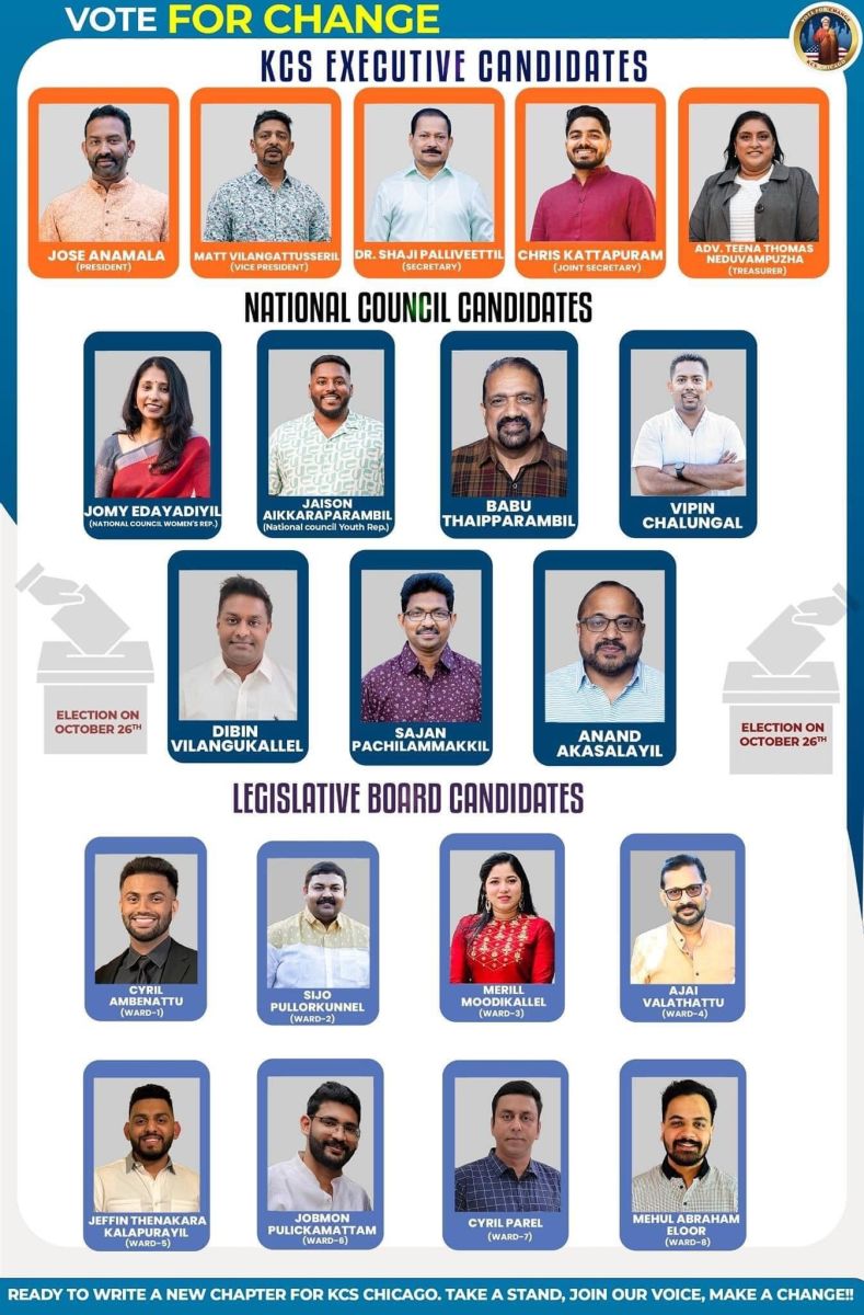 ചിക്കാഗോ കെ.സി.എസ് വൈസ് പ്രസിഡണ്ട്, ഇന്ത്യന് സോഷ്യല് വര്ക്കേഴ്സ് അസോസിയേഷന് വൈസ് പ്രസിഡണ്ട് തുടങ്ങിയ വിവിധ നിലകളില് പ്രവര്ത്തിച്ച് കഴിവ് തെളിയിച്ചിട്ടുള്ള ജോസ് ആനമല പ്രസിഡണ്ടായി നേതൃത്വം കൊടുക്കുന്ന ടീമില് മാറ്റ് വിളങ്ങാട്ടുശ്ശേരില് (വൈസ് പ്രസിഡണ്ട്), ഡോ. ഷാജി പള്ളിവീട്ടില് (സെക്രട്ടറി), ക്രിസ് കട്ടപ്പുറം (ജോയിന്റ് സെക്രട്ടറി), അറ്റോര്ണി റ്റീന തോമസ് നെടുവാമ്പുഴ (ട്രഷറര്) എന്നിവര് മത്സരിക്കുന്നു. ജോമി ഇടയാടിയില്, ജെയ്സണ് ഐക്കരപറമ്പില്, ബാബു തൈപ്പറമ്പില്, വിപിന് ചാലുങ്കല്, ഡിബിന് വിലങ്ങുകല്ലേല്, സാജന് പച്ചിലമാക്കില്, ആനന്ദ് ആകശാലയില് എന്നിവരാണ് കെസിസിഎന്എ നാഷണല് കൗണ്സില് സ്ഥാനാര്ത്ഥികള്. വിവിധ വാര്ഡുകളില് നിന്നും സിറിള് അംമ്പേനാട്ട്, സിജോ പുള്ളൂര്കുന്നേല്, മെറിള് മൂടികല്ലേല്, അജയ് വാളത്താറ്റ്, ജെഫിന് തേനാകര കളപ്പുരയില്, ജോബ്മോന് പുളിക്കമറ്റം, സിറിള് പാറേല്, മേഹുല് അബ്രഹാം ഏലൂര് എന്നിവര് ലെജിസ്ലേറ്റീവ് ബോര്ഡിലേക്ക് മത്സരിക്കുന്നു.
