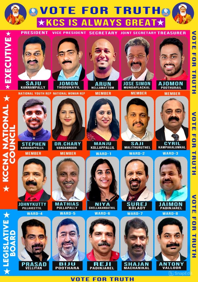 കെ.സി.വൈ.എല് കോട്ടയം അതിരൂപതാ പ്രസിഡണ്ട്, ചിക്കാഗോ കെ.സി.എസ് വൈസ് പ്രസിഡണ്ട് തുടങ്ങിയ വിവിധ മേഖലകളില് പ്രവര്ത്തിച്ച് അംഗീകാരം നേടിയിട്ടുള്ള അഡ്വ. സാജു കണ്ണമ്പള്ളി പ്രസിഡണ്ടായി നേതൃത്വം കൊടുക്കുന്ന ടീമില് ജോമോന് തൊടുകയില് (വൈസ് പ്രസിഡണ്ട്), അരുണ് നെല്ലാമറ്റം (സെക്രട്ടറി), ജോസ് സൈമണ് മുണ്ടപ്ലാക്കില് (ജോയിന്റ് സെക്രട്ടറി), അജോമോന് പൂത്തുറയില് (ട്രഷറര്) എന്നിവര് മത്സരിക്കുന്നു. സ്റ്റീഫന് കണ്ടാരപ്പള്ളില്, ഡോ. ചാരി വണ്ടന്നൂര്, മഞ്ജു കൊല്ലപ്പള്ളില്, സജി മാലിത്തുരുത്തേല്, സിറിള് കമ്പക്കാലുങ്കല്, ജോണിക്കുട്ടി പിള്ളവീട്ടില്, മത്യാസ് പുല്ലാപ്പള്ളി എന്നിവരാണ് കെ.സി.സി.എന്.എ നാഷണല് കൗണ്സില് സ്ഥാനാര്ത്ഥികള്. വിവിധ വാര്ഡുകളില് നിന്നും നിയ ചെള്ളക്കണ്ടത്തില്, സൂരജ് കോലടി, ജെയ്മോന് പടിഞ്ഞാറേല്, പ്രസാദ് വെള്ളിയാന്, ബിജൂ പൂത്തുറ, റെജി പടിഞ്ഞാറേല്, ഷാജന് മച്ചാനിക്കല്, ആന്റണി വല്ലൂര് എന്നിവര് ലെജിസ്ലേറ്റീവ് ബോര്ഡിലേക്ക് മത്സരിക്കുന്നു.