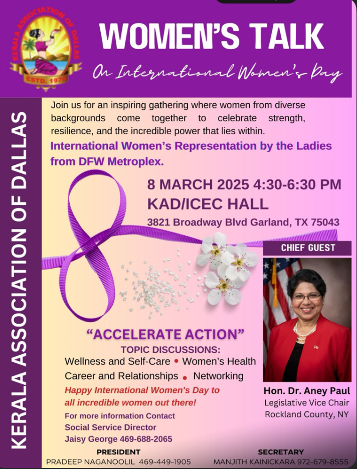 കേരള അസോസിയേഷൻ ഓഫ് ഡാളസ്സിന്റെ ആഭിമുഖ്യത്തിൽ മാർച്ച് 8 വൈകീട്ട് 4:30-6:30 PM കെഎഡി/ഐസിഇസി ഹാളിൽ( 3821 ബ്രോഡ്വേ ബൊളിവാർഡ് ഗാർലൻഡ്)പ്രസിഡന്റ് പ്രദീപ് നാഗനൂലിന്റെ അധ്യക്ഷതയിൽ ചേരുന്ന സമ്മേളനത്തിൽ ബഹു. ഡോ. ആനി പോൾ ലെജിസ്ലേറ്റീവ് വൈസ് ചെയർ റോക്ക്ലാൻഡ് കൗണ്ടി, ന്യൂയോർക്ക് മുഖ്യ പ്രഭാഷണം നടത്തും.